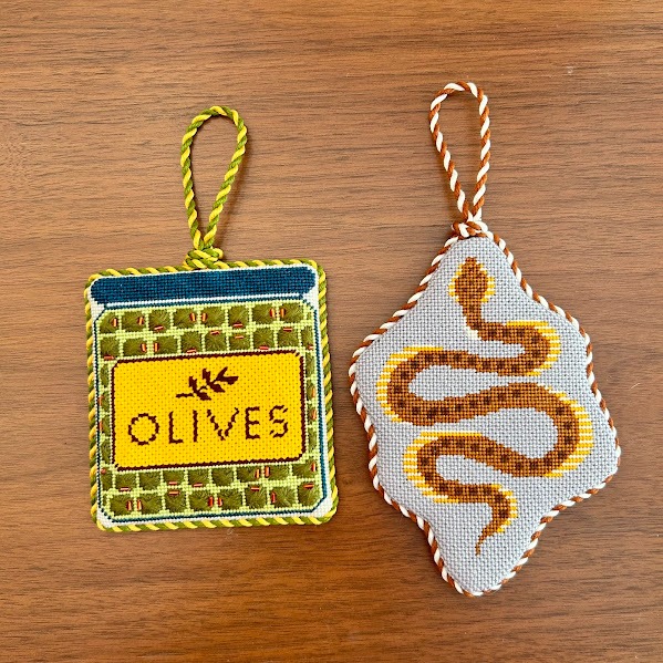The stitcher "simplified" these shapes by filling in the areas where the jar meets the lid, and making a general wavy pattern around the snake.
